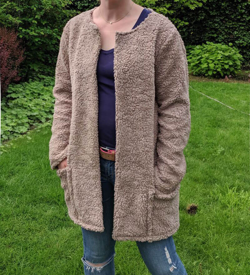 Der Teddystoff ist kuschelig weich und elastisch. Dadurch kann man Mützen und Schals aller Art daraus nähen. Jacken und Westen natürlich auch. Oder nähe doch mal unser Kuschelkissen “Bambi” aus diesem Material? Abbildung Schnittmuster Weste Yonca, Damenjacke Tosha, Tatjana in Braun. Schnittmuster Kuscheltiere Bambi und Drama Lama in Natur. Kinderjacke Kiran in Grau. Schildkröte Romea und Troyer Pullover Reesa.