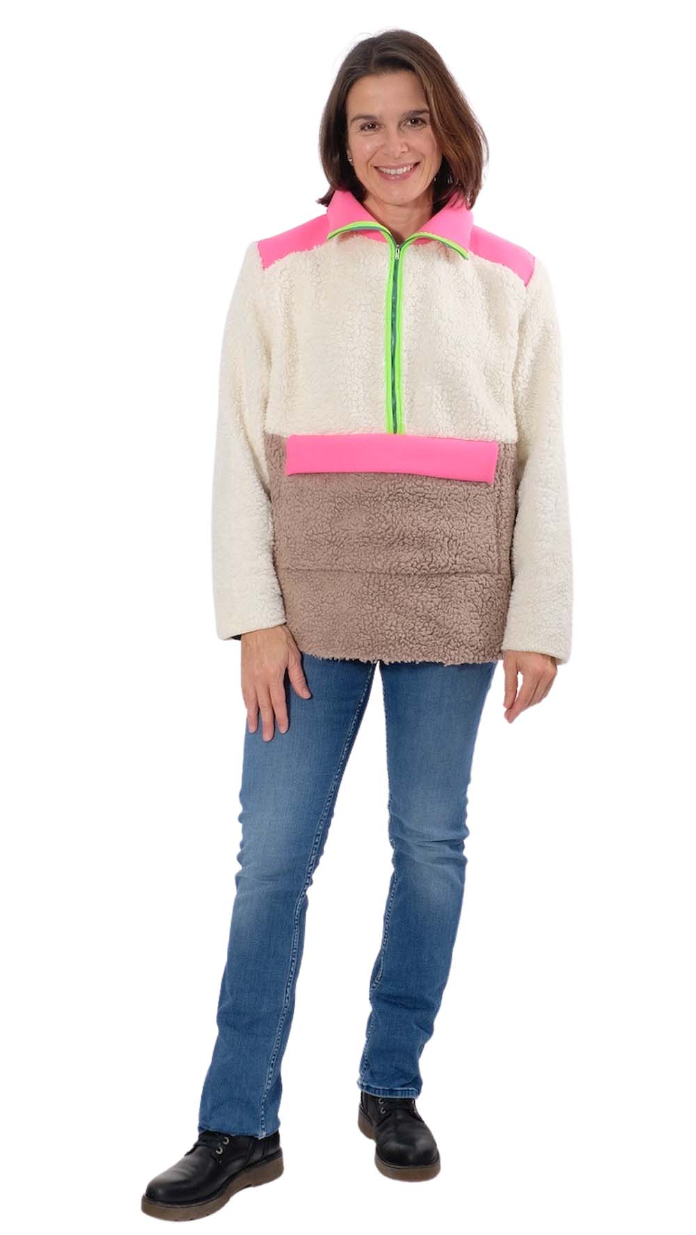 Pflege: Nur mit Feinwaschmittel und am besten mit Handwäsche oder Wollwaschgang bei niedriger Temperatur waschen. So wenig wie möglich schleudern, denn jeder Schleudergang “verändert” den Stoff. Nach dem Trocknen 5-10 Minuten bei kalter Temperatur in den Trockner geben, dadurch wird der Teddystoff wieder schön fluffig.