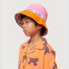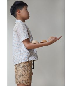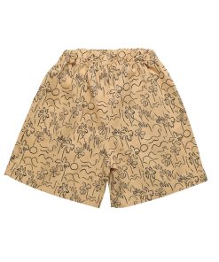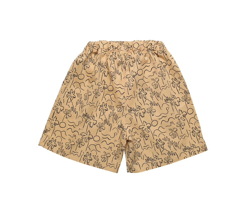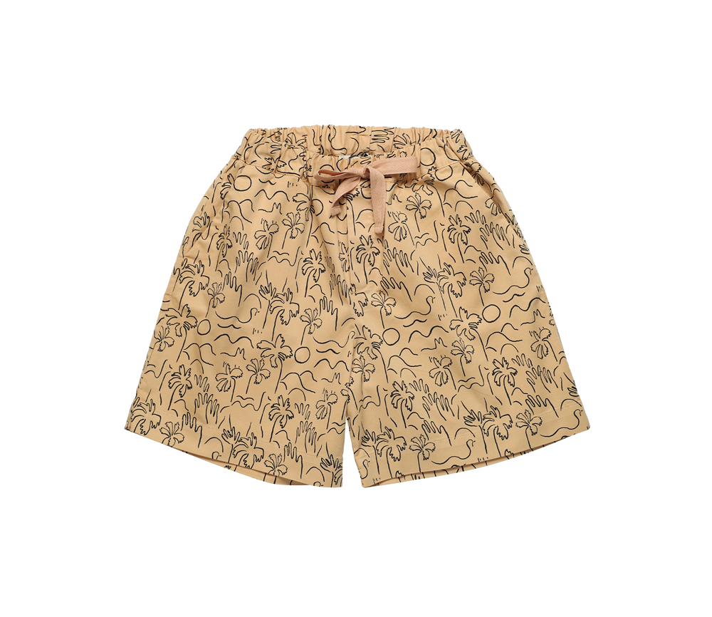 Bermudashorts mit elastischem Bund und Band aus kamelfarbener Popeline-Baumwolle mit Palmen-Print.