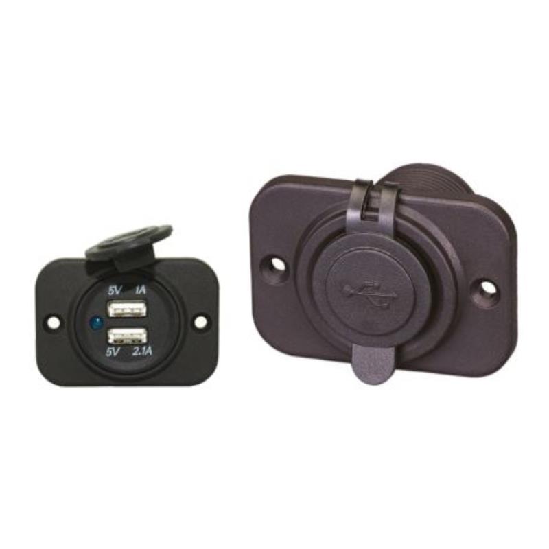 Mit 2 USB-Steckdosen 5 Volt (1x 1A, 1x 2,1A), Eingang 12 Volt, mit PVC Abdeckkappe. Kann mit oder auch ohne Rahmen eingebaut werden. Einbautiefe 51mm, USB-Dose rund Durchmesser 36,5mm, Rahmen 60×42,5mm. Wasserdicht gemäß IP65
