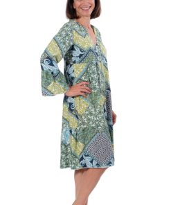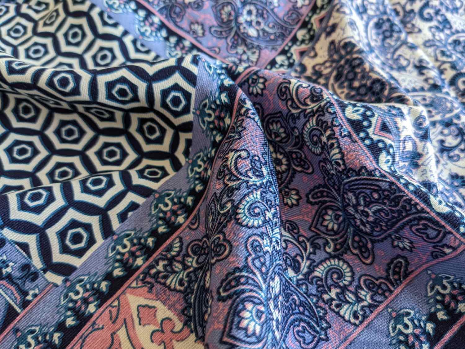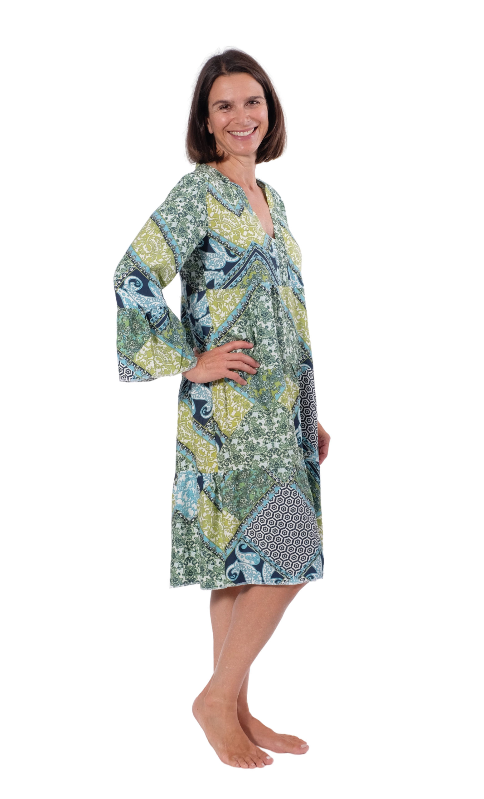 Dieser Viskosestoff mit einem Patchwork Druck ist leicht fallend und hat eine tolle Haptik. Diese Qualität ist pflegeleicht, knitterarm und bietet einen hohen Tragekomfort. Der Stoff eignet sie sich toll für leichte Sommerhosen, Tunikas, Hemden, Kleider, Röcke und vieles mehr. Abbildung Schnittmuster Boho Kleid Francesca in grüner Farbstellung und weitere SM zur Inspiration. Dieser Stoff ist nur noch begrenzt am Lager und in 0,5 Meter Einheiten zu kaufen. Natürlich werden alle gekauften Einheiten am Stück geliefert.