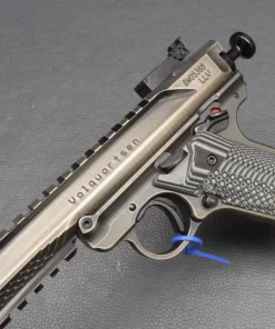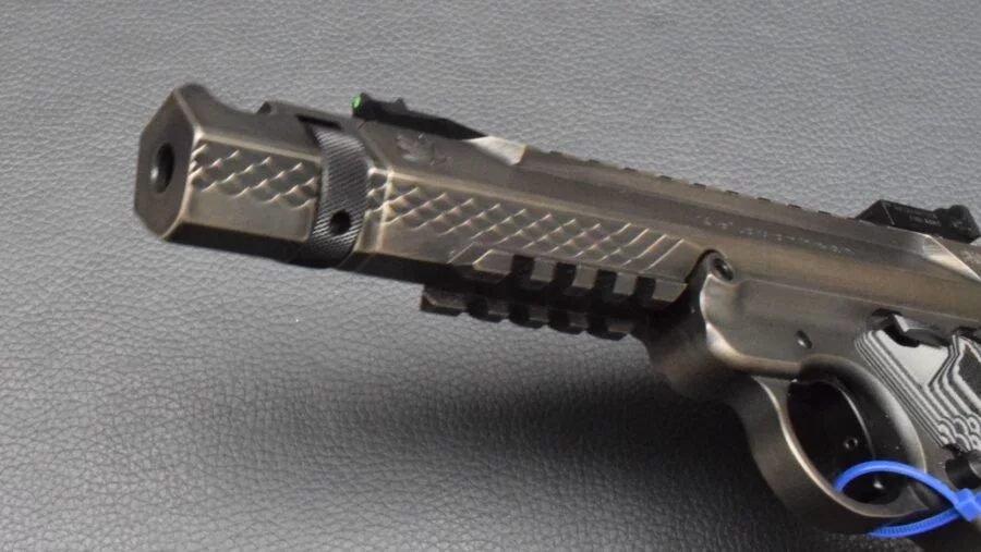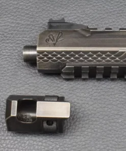 4,5″ Matchlauf, Lauf mit Mündungsgewinde 1/2x28UNEF und Kompensator, Volquartsen Competition Verschluss mit DLC-Beschichtung, Micrometervisierung, Target Hi-Viz Korn,