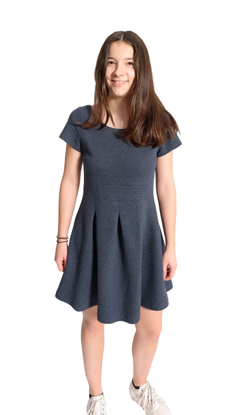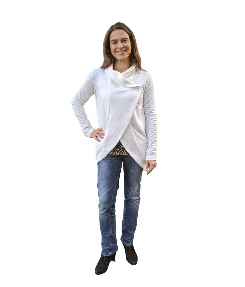 Ein aktuell angesagter, dehnbarer “Waffelstoff”. Er liegt wunderbar auf der Haut und ist kuschelig zu tragen. Du kannst ihn für Pullover, Kleider, Röcke und Sweatshirts verwenden. Abbildung Schnittmuster Kleid Jördis in Mauve. Jacke Heaven, Kleid Amanda und Pia in Blau /Ecru, die Hose aus unserem aktuellen Hosenbuch in Taupe, Shirt Tamme in Grau.