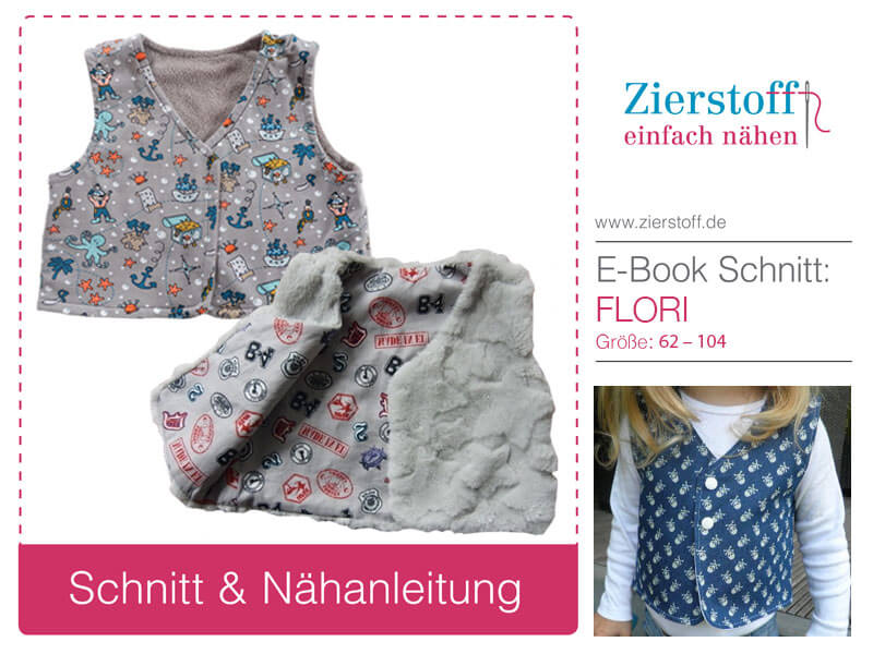 - 2 Schnitte für die Weste Flori. Eine detaillierte und bebilderte Nähanleitung von Gr. 62 – 104. Schritt für Schritt wird alles ganz genau erklärt.