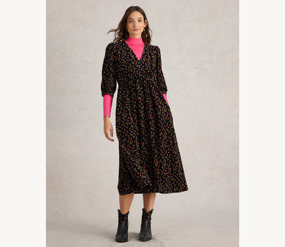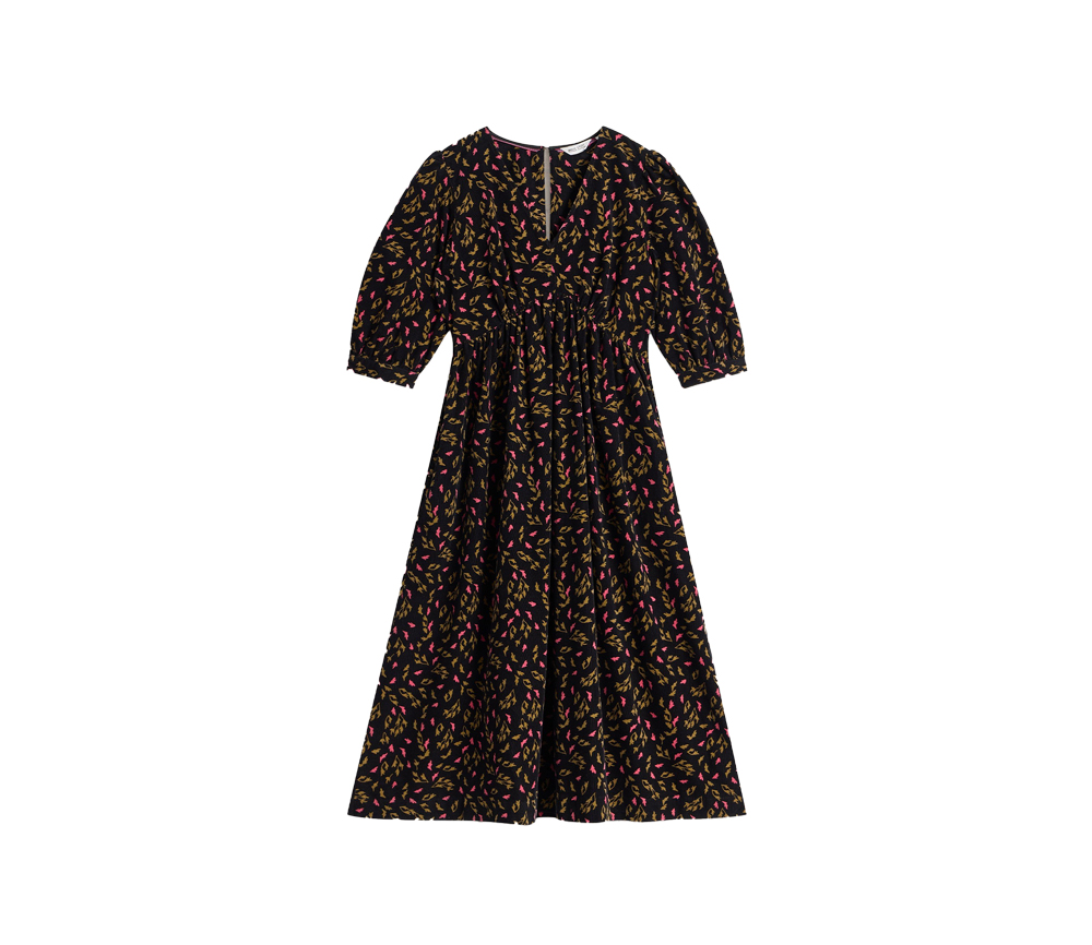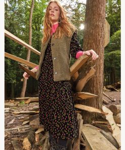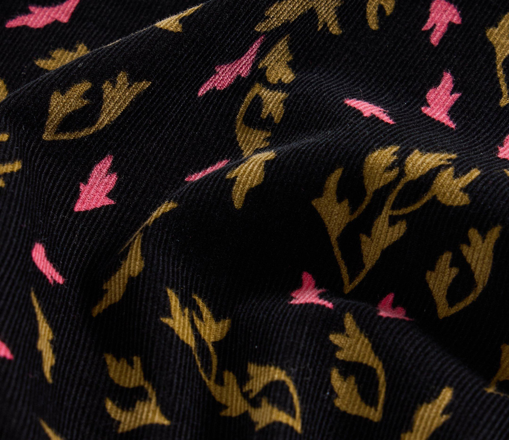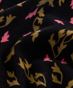Feiner Kord mit fallenden Blättern, ein femininer Schnitt mit elastischen Manschetten, ein V-Ausschnitt, und die bei uns so beliebte elastische Taille. Trage es allein oder über einem farbenfrohen Top als Kontrast.